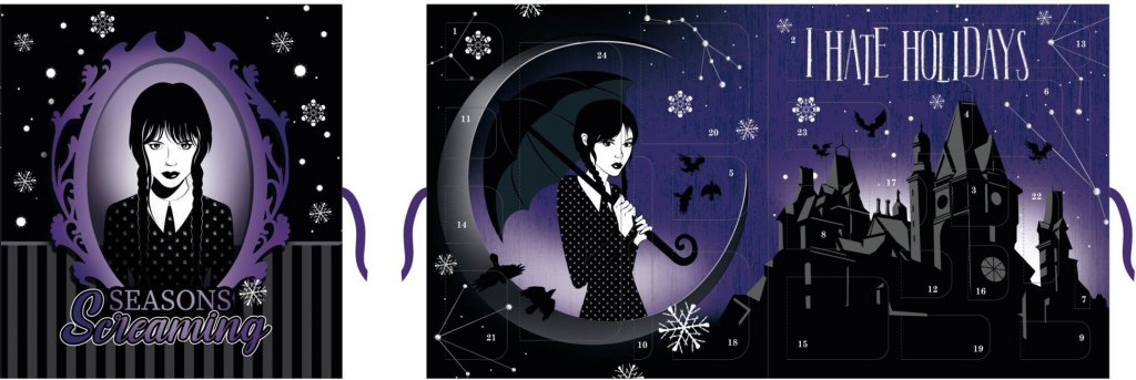 Jokaisen luukun takaa löytyy uusi yllätys Wednesday Addamsin maailmasta – täynnä kimallusta, tyyliä ja persoonallisuutta.