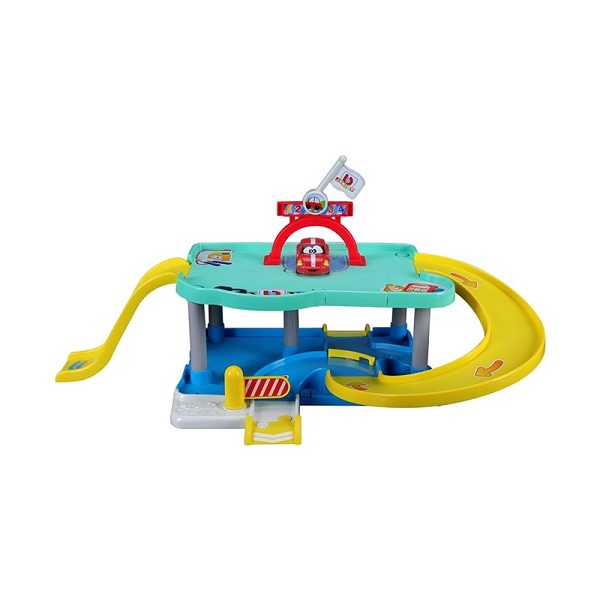 Ensimmäisessä pysäköintihallissani on sekä sisään- että ulosluiska ja siinä on 2 kerrosta. Pysäköintihalli on noin 65,5x38,5x31,5 cm. Saat myös joukon koristetarroja, jotka voit laittaa hieman haluamallasi tavalla.