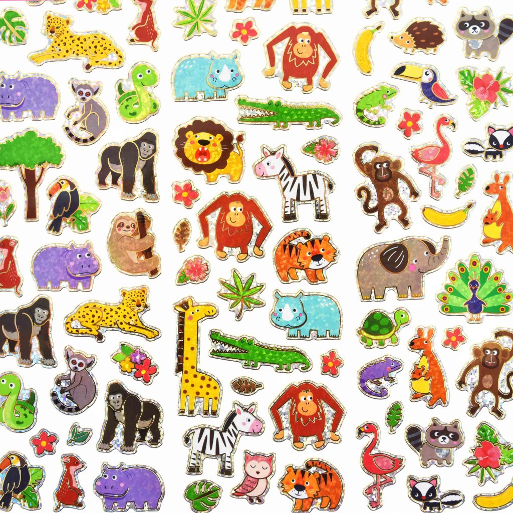 Hienoja motiiveja eläinten maailmasta! Näissä tarroissa on gorilloja, kirahveja, elefantteja, krokotiileja ja paljon muita eläinlajeja. Tarroja on yli 100 kappaletta, mukana on myös kukkia, pensaita ja puita. Täydellisiä koristeita suosikkiesineille kotona! - Tarroja eläinaiheilla - Yli 100 kpl
