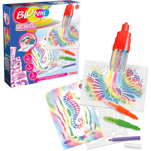 Sisältää Blopens, stensiilit ja paperiarkkeja, jotta voit alkaa maalata uudelleen. Tämän joukon regnbågstema saavat 1 Rainbow blopen, 6 mini-blopens, 6 stensiilit ja paperia.