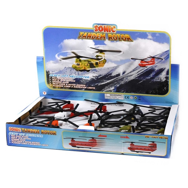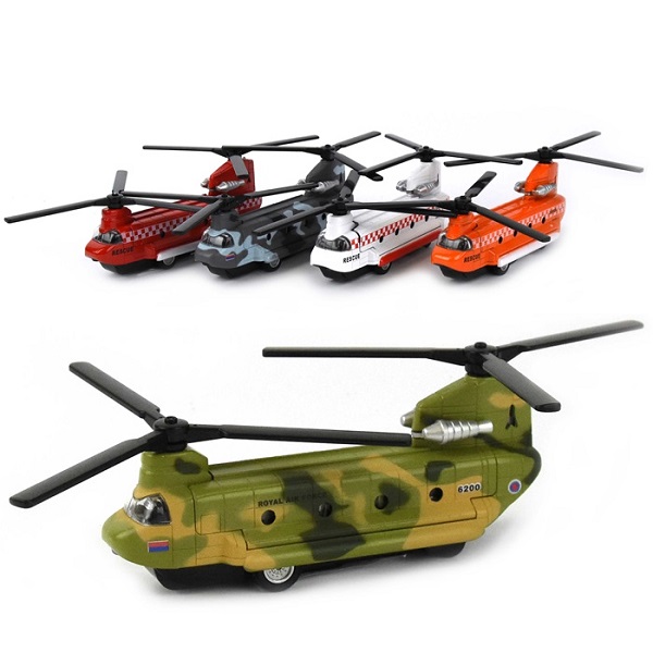 Helikopterissa on myös pyörät, joissa on "Pull back" -järjestelmä. Kun vedät lelua taaksepäin ja vapautat sen, veitset alkavat pyöriä ja simuloivat todellista alkua.