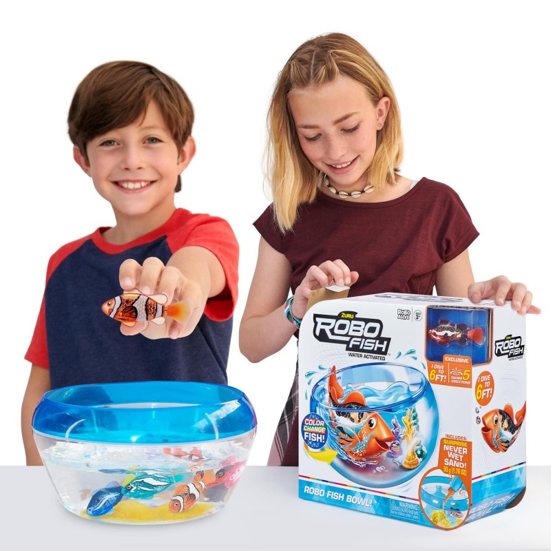 Zuru Robo Alive -kalamalja robottikalalla, joka käyttäytyy niin paljon kuin tavallinen kala, että voit uskoa sen olevan oikea. Laita kala kulhoon täyttämisen jälkeen vedellä ja katsele kalan uivan 5 eri suuntaan. Kala muuttaa myös väriä, kun se on vedessä! Siellä on myös "never wet hiekkaa", jonka avulla voit luoda koralliriuttoja kaloille. Laita hiekka ruiskutuspulloon ja luo siistit rakennelmat.