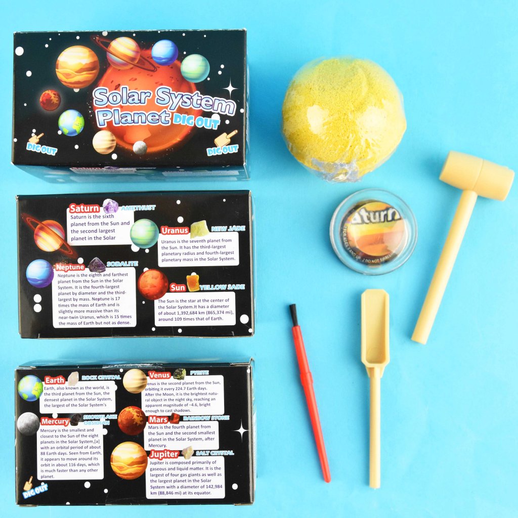 Jännittävä ja hauska tapa oppia aurinkokunnasta! Tämän setin avulla voit kaivaa esiin hienon lelujalokiven kaukaisesta planeetasta. Käytä mailaa, talttaa ja harjaa varovasti poistaaksesi ulkokerroksen ja paljastaksesi sen, mikä piilee sisällä. Setti sisältää myös suurennuslasin, jotta voit tutkia löytöjäsi. Kerää kivet kaikilta 9 planeetalta! - Sisältää mailan, taltan, harjan ja suurennuslasin - 9 erilaista vaihtoehtoa kerättäväksi