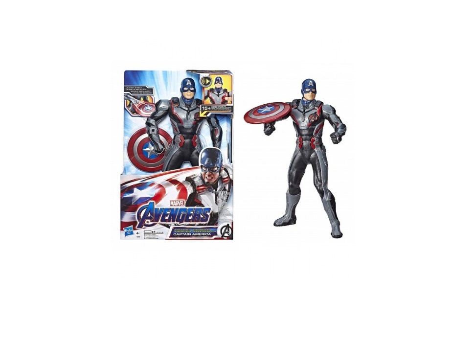 Kun lapset vetää käsivarren takaisin tästä 33 cm pitkä Kapteeni Amerikka hahmo, heitetään kilpensä pois ja äänitehosteet ja lauseita aktivoituvat.
