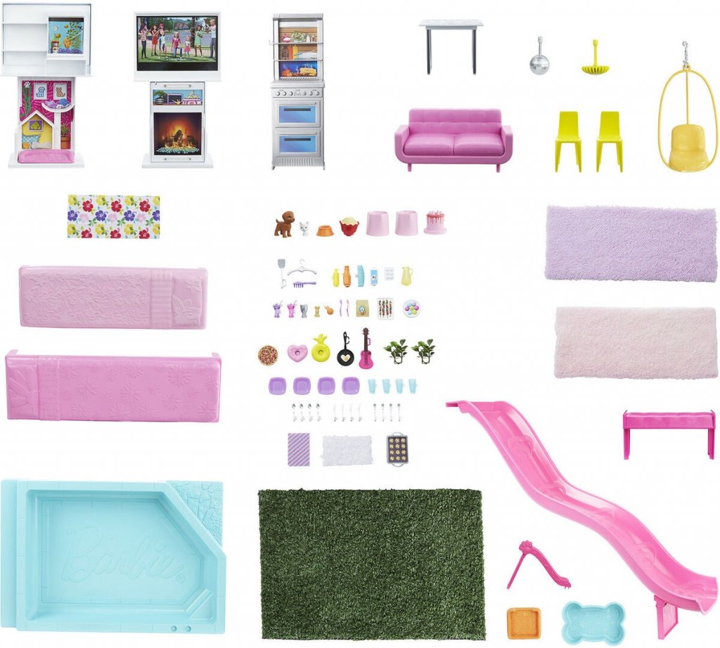 Mutta tehdäkseen Barbie Dreamhousesta vieläkin erikoisemman, huonekalut ovat vaihdettavissa ja ne voidaan vaihtaa. Koska BBQ -grilli voidaan muuntaa jälkiruokabuffetiksi, viihdekeskuksesta voi tulla leikkialue. Lasten mielikuvitus voi mennä niin pitkälle kuin haluavat ja keksiä erilaisia tarinoita ja skenaarioita!
