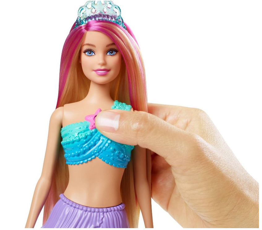 Upota Barbie-merenneito-nukke veteen ja katso hänen helmiäispyrstön kiiltoa yhdellä neljästä värikkäästä valovaihtoehdosta. Barbie Dreamtopia Twinkle Lightin merenneito-nukke hyppää kylpyammeeseen tai uima-altaaseen, mutta lapset voivat myös viedä hauskoja pelejä maihin. Paina Barbie-nuken sydämen tähden muotoista nappia nauttiaksesi valoshowsta ilman vettä. Rainbow Fena, vaaleanpunaiset raidat hiukset ja prinsessatiara täydentävät Barbie-nuken värikästä merenneito-ilmettä.