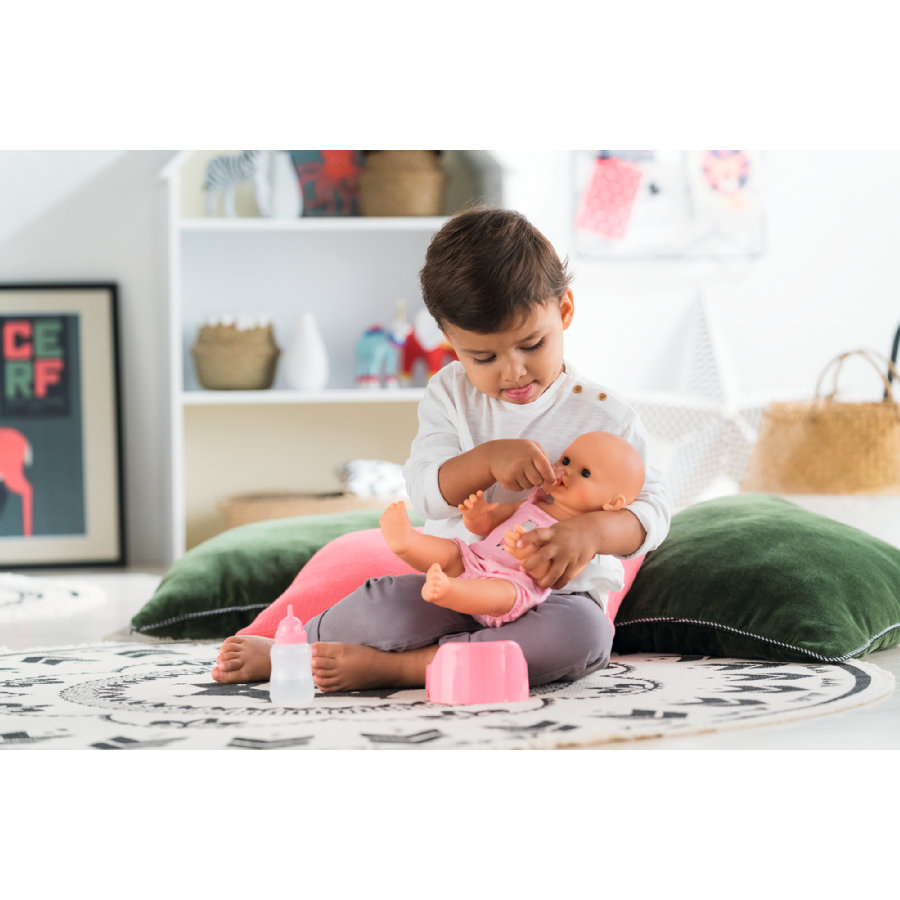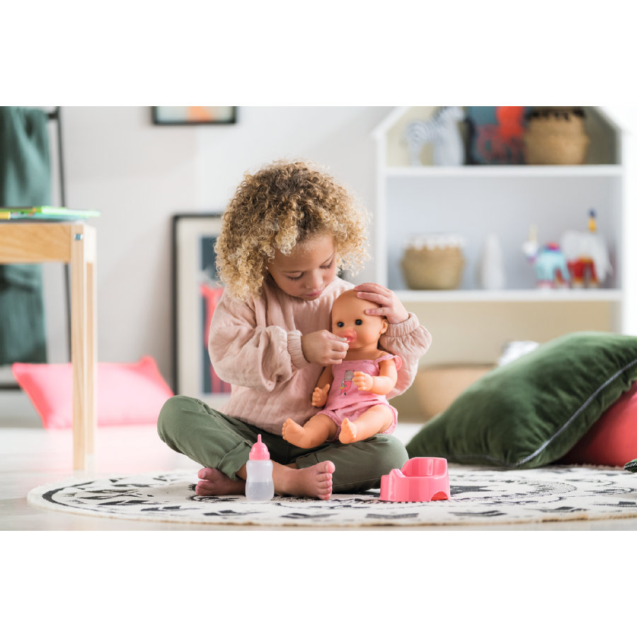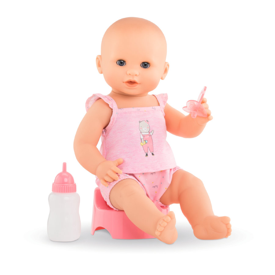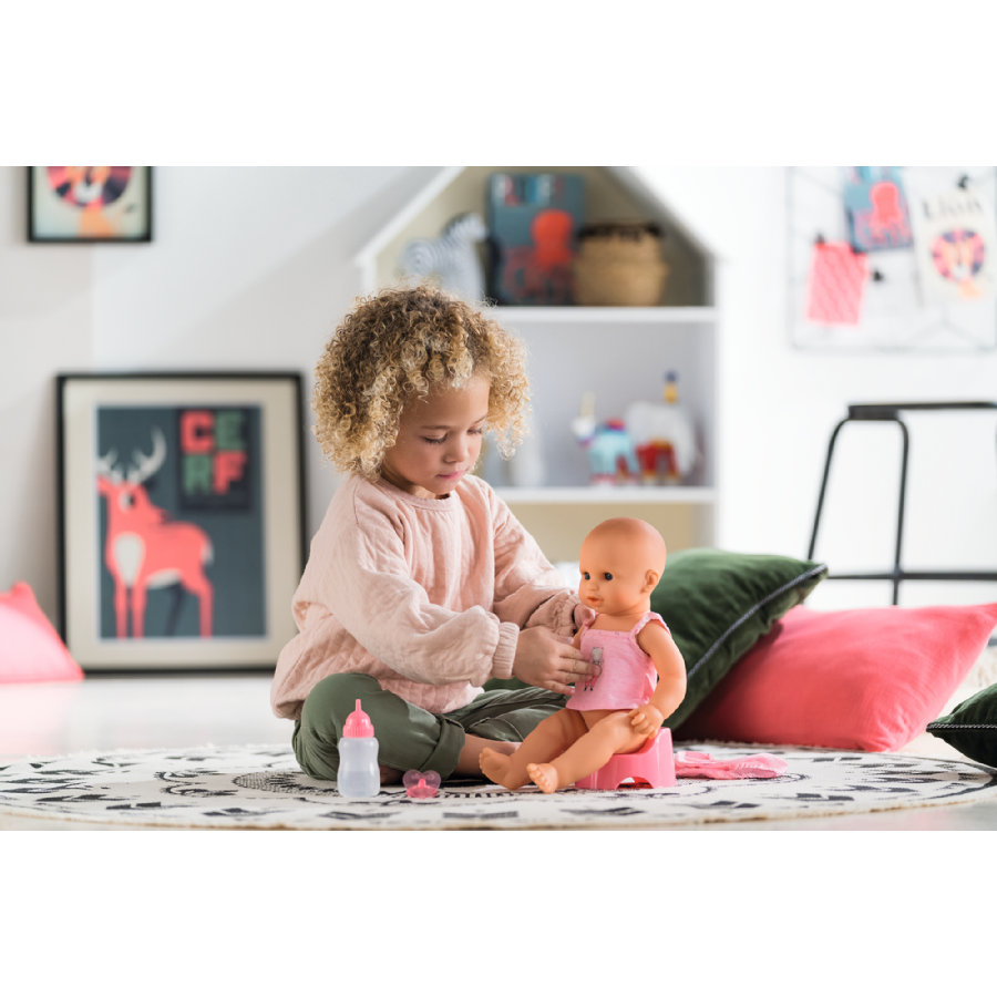 Kaunis leikkisetti jonka mukana tulee pullo, potta ja vauvanukke. Voit ruokkia häntä ja opettaa hänet käymään potalla. Tiesitkö, että Emma juo ja käy pissalla oikeasti? Hän on kuin oikea vauva! Anna hänelle ensin juoma hänen täytettävällä pullollaan ja paina sitten vatsaa niin hän menee vessaan. Tämä leikkisetti sisältää myös tutin, jos hän itkee laita se hänen suuhunsa rauhoittaaksesi hänet ja anna hänen nukkua rauhassa.