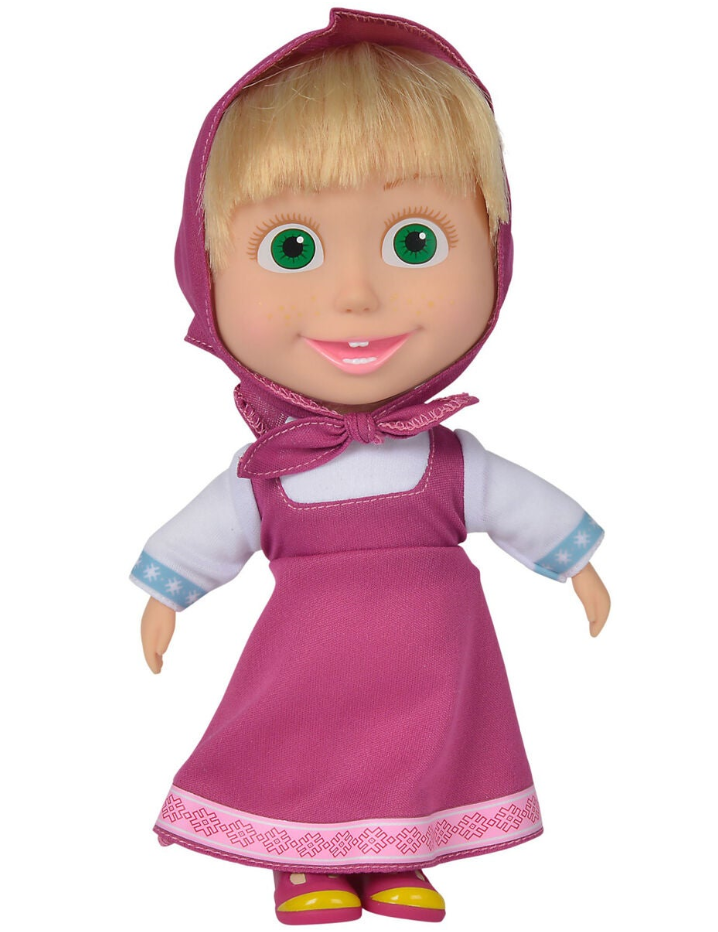 Masha on 23x10x7 cm nukke, jolla on pehmeä runko ja kovat kädet, jalat ja pää.