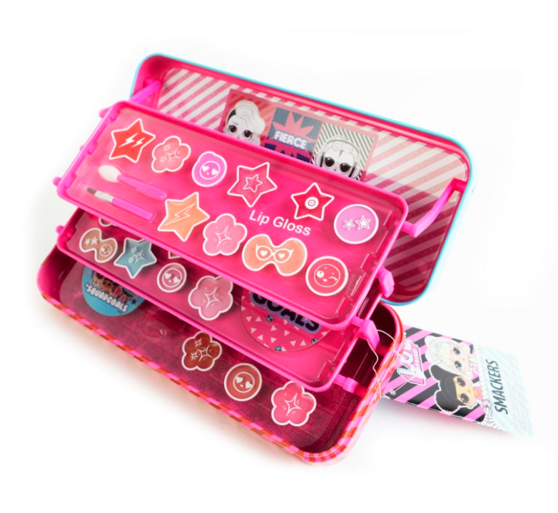Sisältää: 16 erilaista huulikiiltoa (yhteensä 9 g), 8 erilaista hohtavaa voidetta (yhteensä 4,1 g), huuliharjan, applikaattorit, tarrat ja 2 hiusklipsiä.