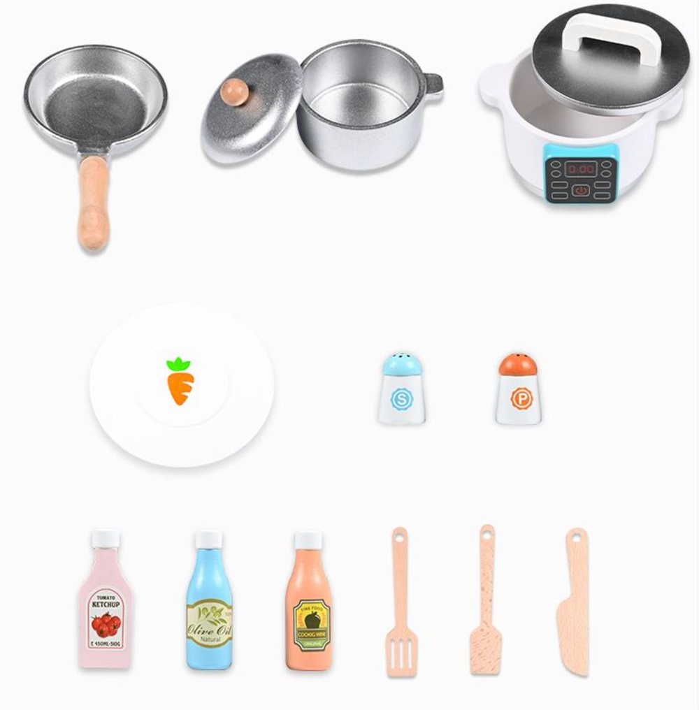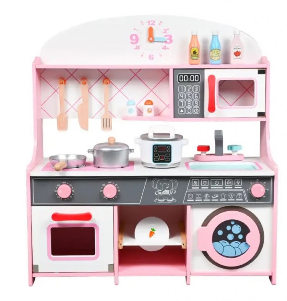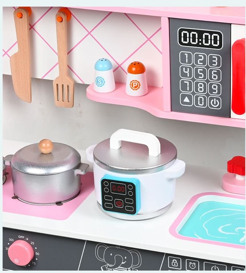 Lelukeittiö on varustettu astianpesukoneella, uunilla, mikroaaltouunilla, tiskialtaalla, hyllyillä sekä runsaalla määrällä keittiövälineitä, mikä mahdollistaa koko ruoanlaittoprosessin leikkimisen alusta loppuun. Kätevät säilytystilat helpottavat tarvikkeiden järjestyksessä pitämistä myös leikin jälkeen.