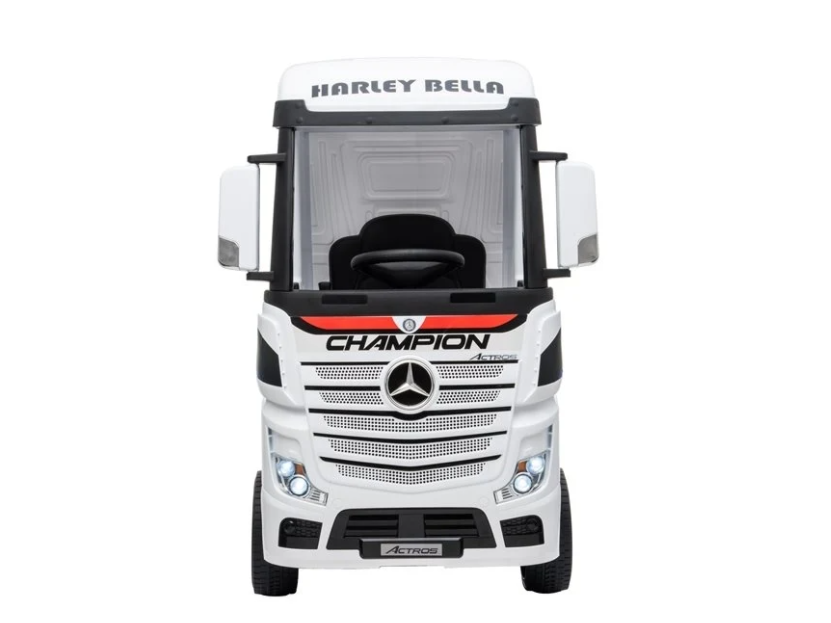 Ohjaa kuorma-autoa kauko-ohjaimella, lapsi voi istua kuorma-autossa, kun aikuinen ohjaa kuorma-autoa. Lapset voivat ajaa autoa itse, kun he ovat oppineet hallitsemaan kuorma-autoa itse. Mercedes Actros Truck on varustettu kahdella tehokkaalla 12V akulla, jotka käyttävät 4 tehokasta 12V moottoria. Tämä tekee kuorma-autosta täydellisen ajoon kaikenlaisilla teillä. Kuorma-auto on varustettu sekä valoilla että istuimilla aitoa nahkaa!