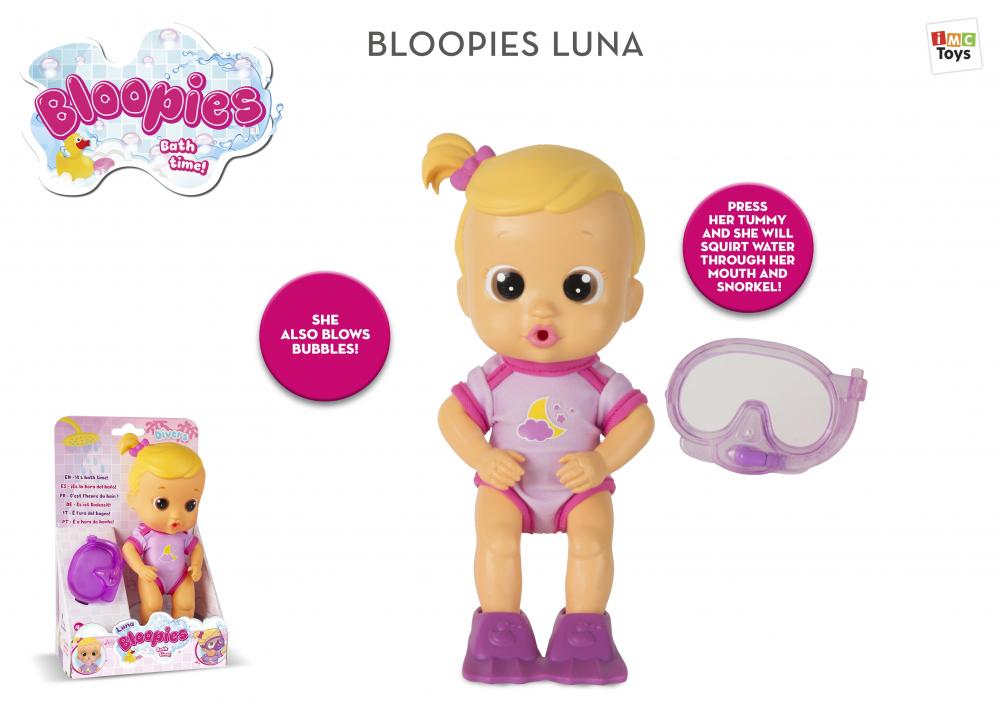 Luna rakastaa uintia ja vedellä leikkimistä. Paina nuken vatsaa ja se suorittaa erilaisia temppuja. Kun painat vatsaa, kun nukella on snorkkeli päällä, vesi ruiskuaa snorkkelista. Ilman snorkkeliä, nukke voi suihkuttaa sekä vettä että kuplia suustaan. Lapset eivät koskaan halua lopettaa uintireissua!