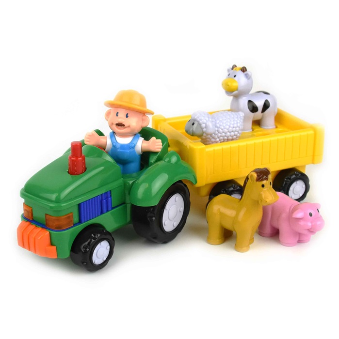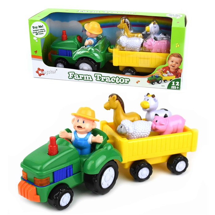 He oppivat tyypillisiä äänet tilaan ja sen eläimiä, kuten lehmä, lammas, hevonen ja sika, sekä tunnettu laulu Old McDonald oli maatila"". tämä traktori valoa, musiikki ja ääni on pyörivät pyörät, perävaunun kuljettava lemmikkejä mukava ratsastaa pitkin maatilan.