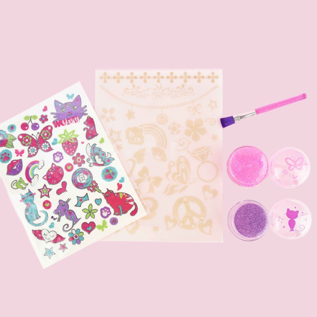 Herkullisia tatuointeja, jotka todella erottuvat! Tämä setti sisältää kimalletta ja paljon upeita tatuointimotiiveja valittavaksi. Mukana tulevalla harjalla voit levittää kimalletta tatuointeihin haluamallasi tavalla. Tatuoinnit kiinnittyvät helposti ihoon ja ovat myös helppo poistaa. - Setti hohdetatuointeja varten Tuotetiedot: Suositeltu ikä: 3 vuodesta alkaen
