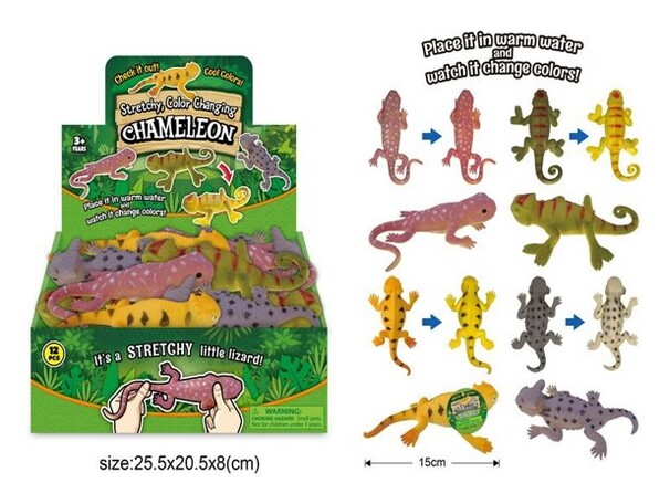 Upea lisko, joka tarjoaa jotain aivan erityistä! Kun laitat sen kuumaan veteen, se muuttaa väriä herkullisella tavalla. Kuin kameleontti viidakossa! Liskolla on hieno, realistinen muotoilu ja se on saatavilla useissa hienoissa väreissä. Se on joustava ja miellyttävä leikkiä. - Värinvaihtava lisko kuumassa vedessä