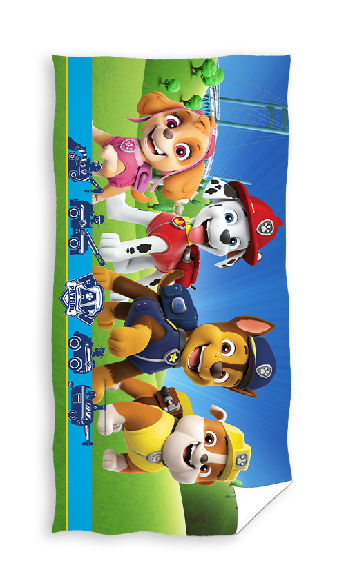 Ryhmä Hau -hahmojen Skye, Rubble, Marshall, ja Chase kuvilla varustettu pyyhe. Pyyhettä voidaan käyttää rannalla tai muilla uimapaikoilla.