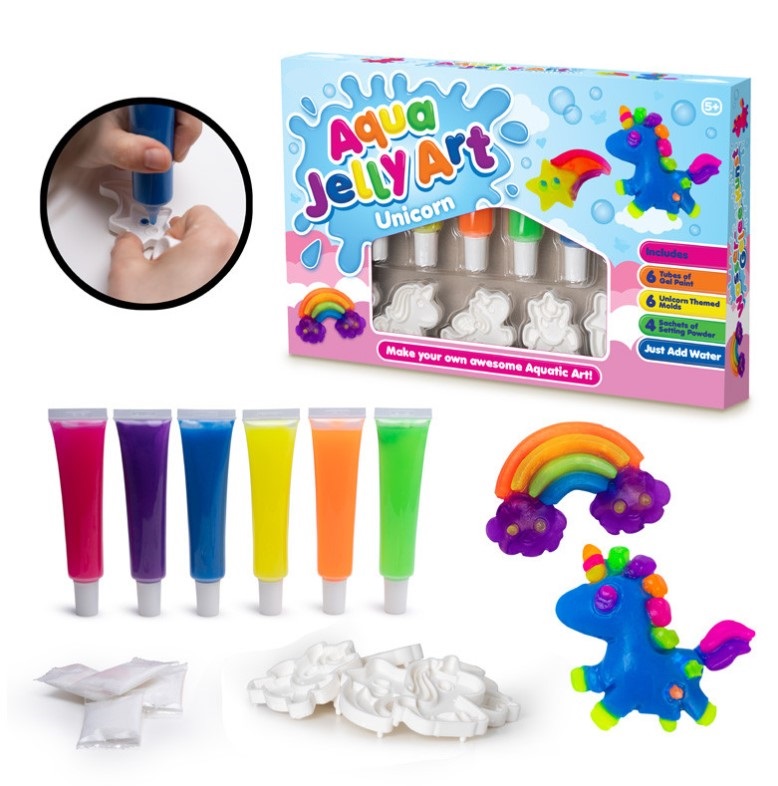 Luo valikoima monivärisiä yksisarvisia muotoja tällä superyksinkertaisella Aqua Jelly Art -askartelusarjalla. Sekoita eri hyytelöputket mukana oleviin muotoihin ja upota ne veteen. Muutaman sekunnin kuluttua kaunis luomuksesi on valmis puristettavaksi ja leikittäväksi!